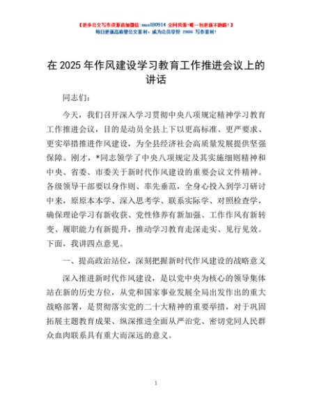 / 在2025年作风建设学习教育工作推进会议上的讲话