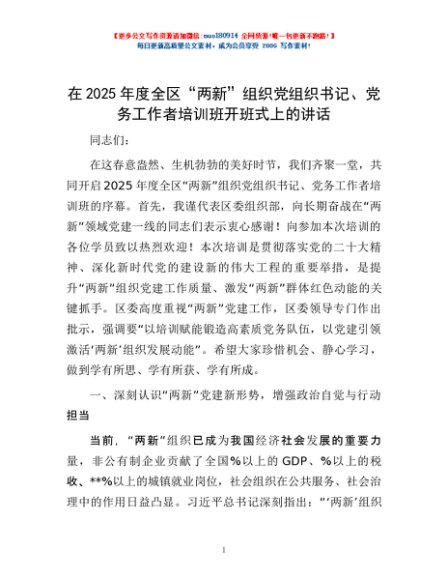 / 在2025年度全区“两新”组织党组织书记、党务工作者培训班开班式上的讲话