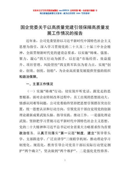 / 国企党委关于以高质量党建引领保障高质量发展工作情况的报告