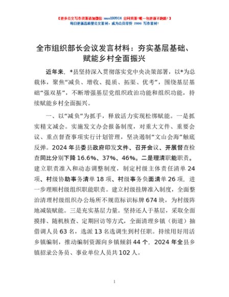 / 全市组织部长会议发言材料:夯实基层基础、赋能乡村全面振兴