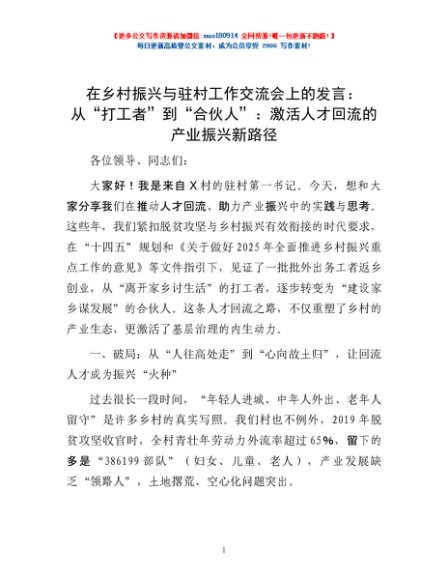 / 在乡村振兴与驻村工作交流会上的发言:从“打工者”到“合伙人”:激活人才回流的产业振兴新路径