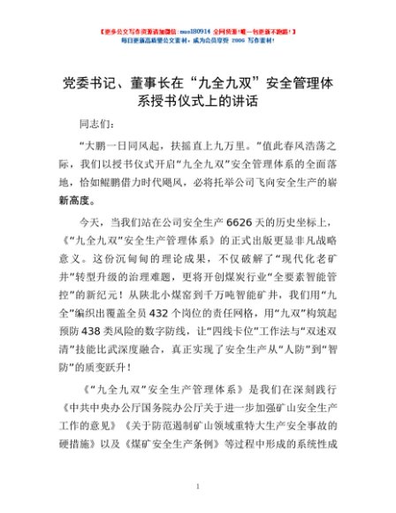 / 党委书记、董事长在“九全九双”安全管理体系授书仪式上的讲话