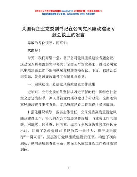 / 某国有企业党委副书记在公司党风廉政建设专题会议上的发言