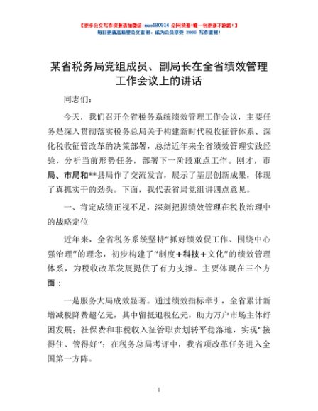 / 某省税务局党组成员、副局长在全省绩效管理工作会议上的讲话