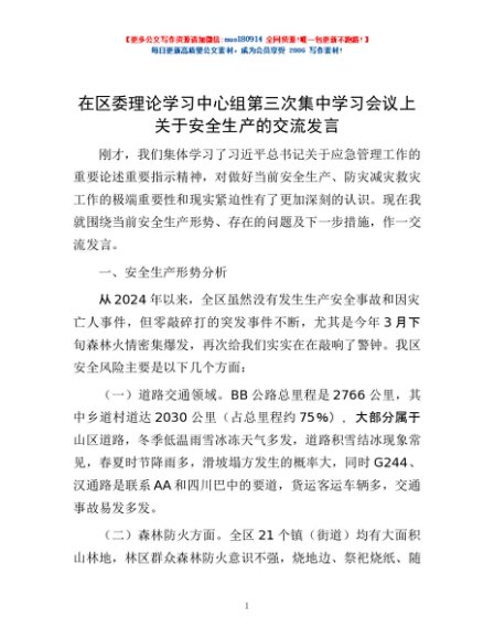 / 在区委理论学习中心组第三次集中学习会议上关于安全生产的交流发言