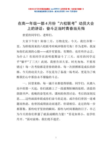 / 在高一年级一部4月份“六校联考”动员大会上的讲话:奋斗正当时青春当无悔