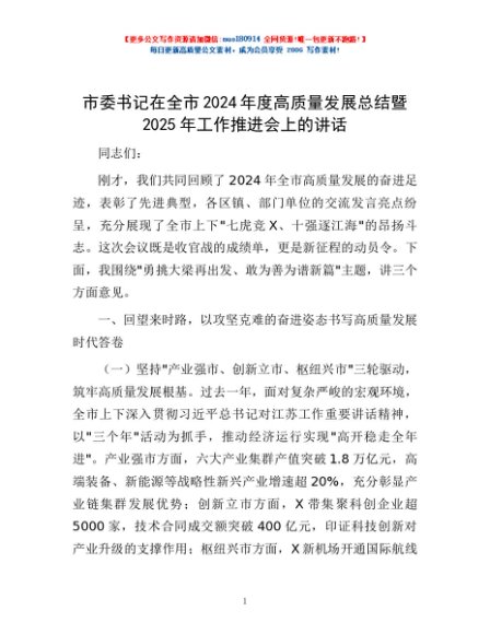 / 市委书记在全市2024年度高质量发展总结暨2025年工作推进会上的讲话