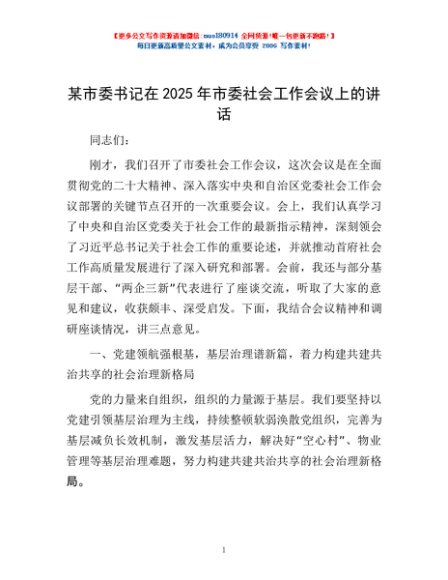 / 某市委书记在2025年市委社会工作会议上的讲话