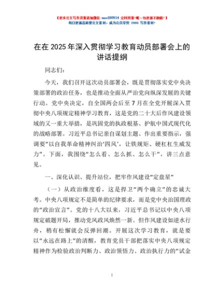 / 在在2025年深入贯彻学习教育动员部署会上的讲话提纲