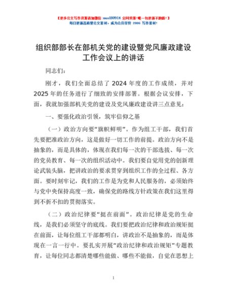 / 组织部部长在部机关党的建设暨党风廉政建设工作会议上的讲话