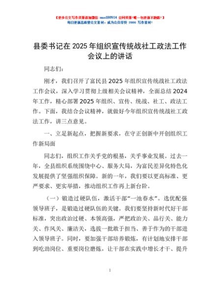 / 县委书记在2025年组织宣传统战社工政法工作会议上的讲话