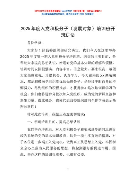 2025年度入党积极分子(发展对象)培训班开班讲话