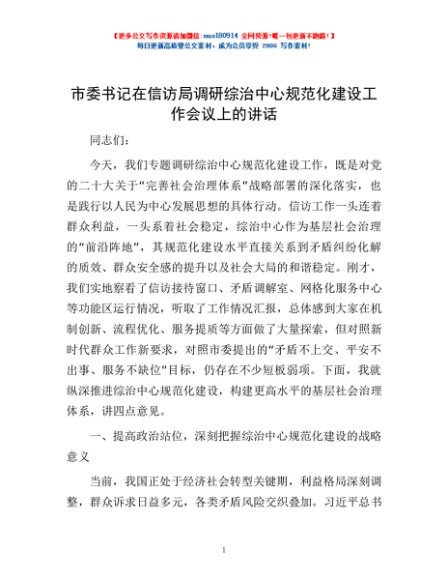 / 市委书记在信访局调研综治中心规范化建设工作会议上的讲话