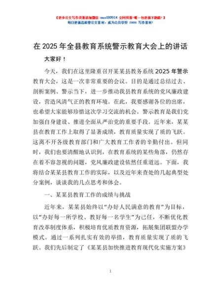 / 在2025年全县教育系统警示教育大会上的讲话