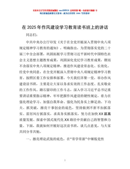 / 在2025年作风建设学习教育读书班上的讲话