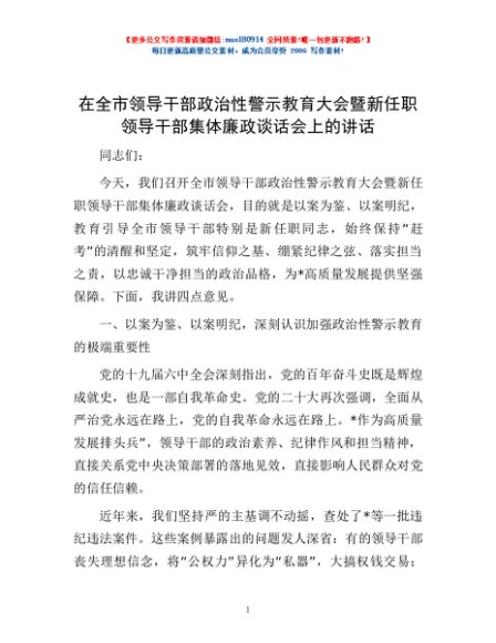 / 在全市领导干部政治性警示教育大会暨新任职领导干部集体廉政谈话会上的讲话