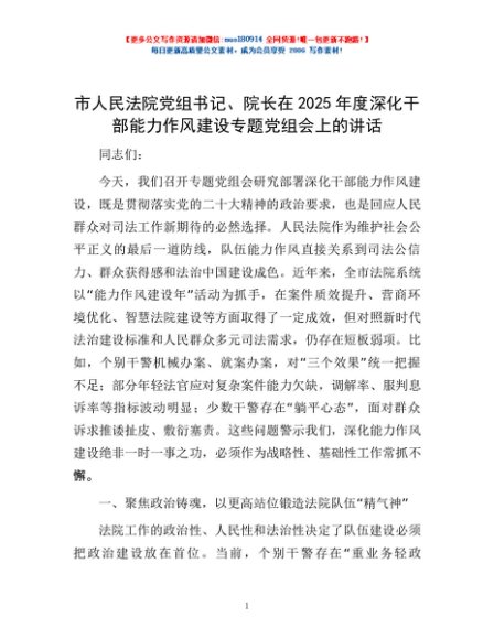 / 市人民法院党组书记、院长在2025年度深化干部能力作风建设专题党组会上的讲话