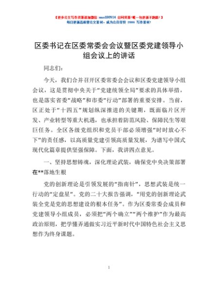 / 区委书记在区委常委会会议暨区委党建领导小组会议上的讲话