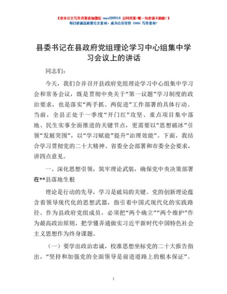 / 县委书记在县政府党组理论学习中心组集中学习会议上的讲话