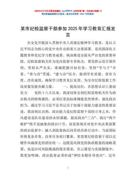 / 某市纪检监察干部参加2025年学习教育汇报发言