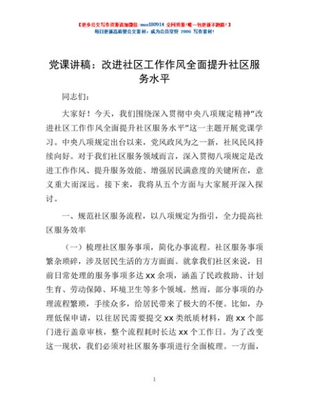 / 党课讲稿: 改进社区工作作风 全面提升社区服务水平