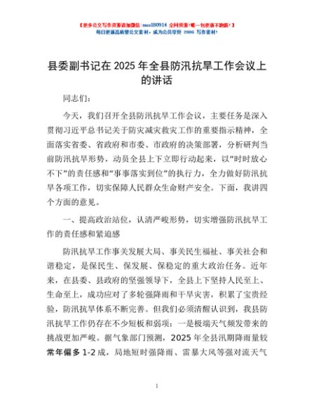 / 县委副书记在2025年全县防汛抗旱工作会议上的讲话