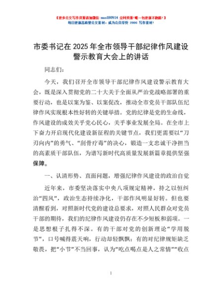 / 市委书记在2025年全市领导干部纪律作风建设警示教育大会上的讲话
