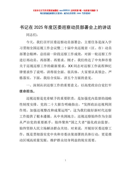 / 书记在2025年度区委巡察动员部署会上的讲话