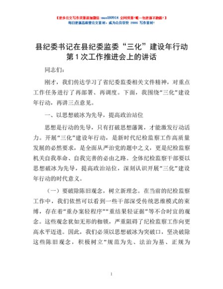 / 县纪委书记在县纪委监委“三化”建设年行动第1次工作推进会上的讲话