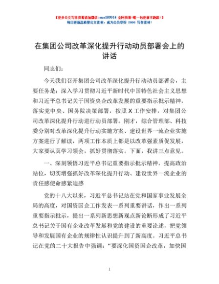 / 在集团公司改革深化提升行动动员部署会上的讲话