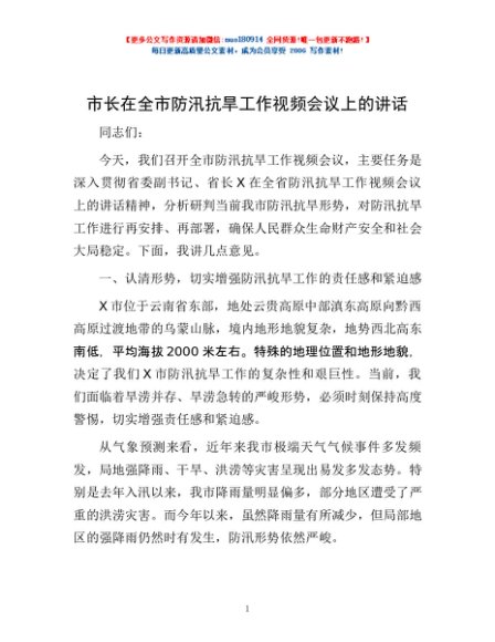 / 市长在全市防汛抗旱工作视频会议上的讲话