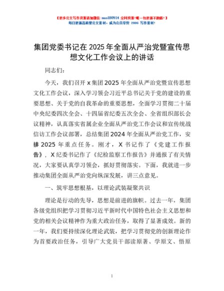 / 集团党委书记在2025年全面从严治党暨宣传思想文化工作会议上的讲话