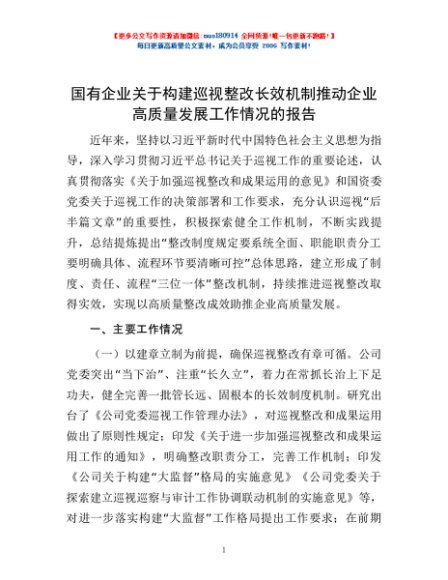 / 国有企业关于构建巡视整改长效机制推动企业高质量发展工作情况的报告