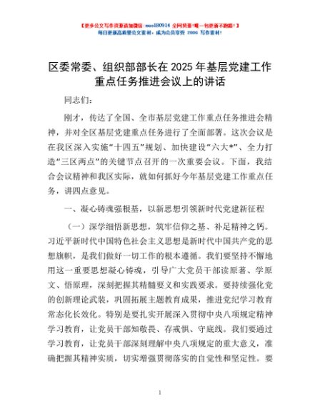 / 区委常委、组织部部长在2025年基层党建工作重点任务推进会议上的讲话