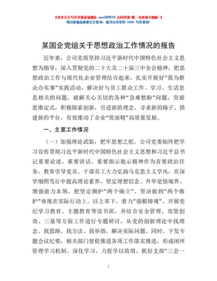 / 某国企党组关于思想政治工作情况的报告