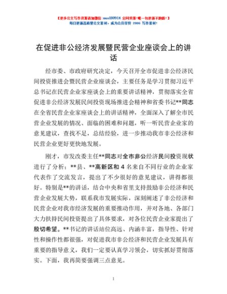 / 在促进非公经济发展暨民营企业座谈会上的讲话