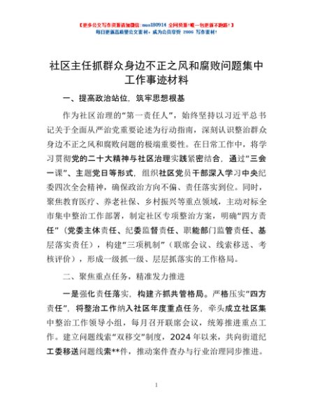 社区主任抓群众身边不正之风和腐败问题集中工作事迹材料