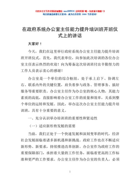 / 在政府系统办公室主任能力提升培训班开班仪式上的讲话