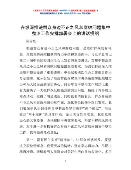 / 在纵深推进群众身边不正之风和腐败问题集中整治工作安排部署会上的讲话提纲
