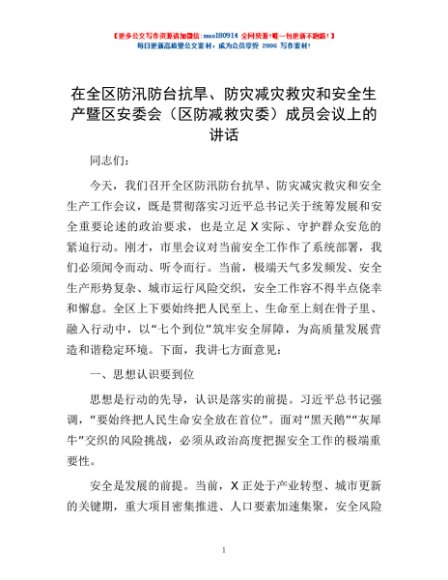 / 在全区防汛防台抗旱、防灾减灾救灾和安全生产暨区安委会(区防减救灾委)成员会议上的讲话