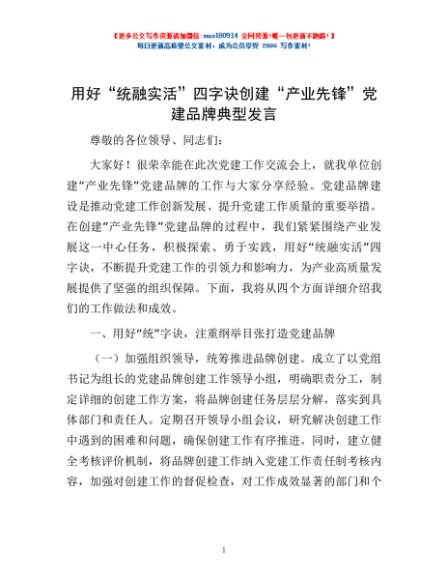 用好“统融实活”四字诀 创建“产业先锋”党建品牌典型发言