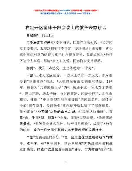 / 在经开区全体干部会议上的就任表态讲话