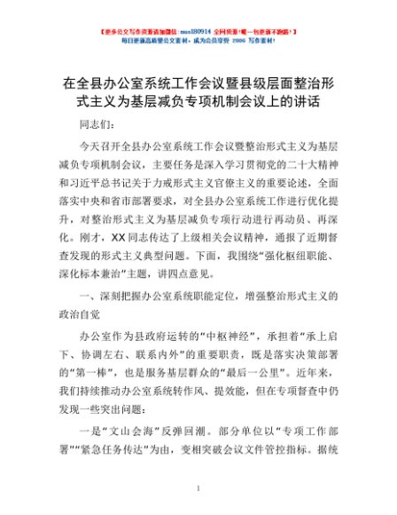 / 在全县办公室系统工作会议暨县级层面整治形式主义为基层减负专项机制会议上的讲话
