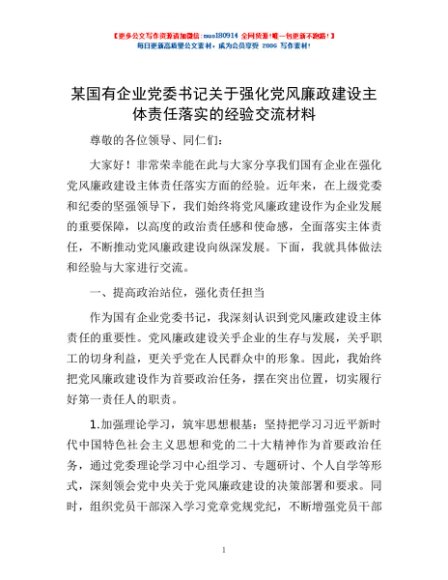 / 某国有企业党委书记关于强化党风廉政建设主体责任落实的经验交流材料