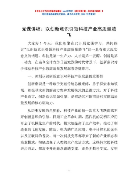 / 党课讲稿:以创新意识引领科技产业高质量腾飞