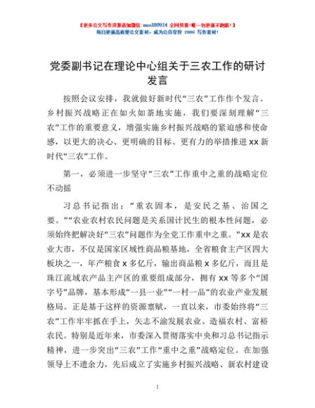 / 党委副书记在理论中心组关于三农工作的研讨发言