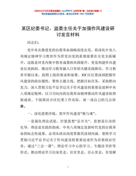 / 某区纪委书记、监委主任关于加强作风建设研讨发言材料
