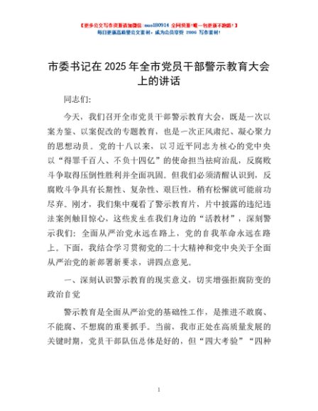 / 市委书记在2025年全市党员干部警示教育大会上的讲话
