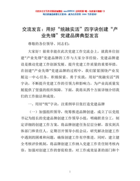 / 交流发言:用好“统融实活”四字诀创建“产业先锋”党建品牌典型发言