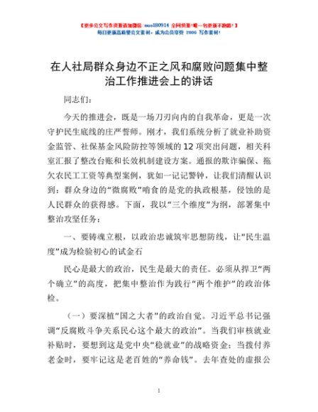 / 在人社局群众身边不正之风和腐败问题集中整治工作推进会上的讲话